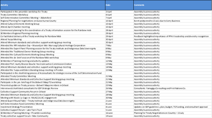 As the Southeast region representative, I remain committed to advocating for our people, building understanding of the Treaty process, and ensuring the voices of our diverse communities are heard. This report provides an overview of my activities during the current reporting period, which included direct community engagement, participation in official Assembly business (as attached), and broader advocacy across local government, Aboriginal organisations, and Treaty-related forums.