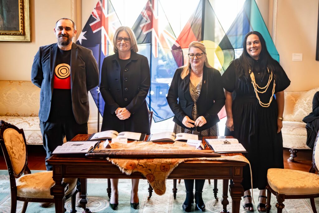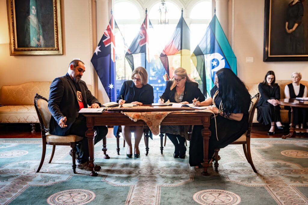 Co-chairs of the First Peoples’ Assembly of Victoria and Assembly Members, Victorian Premier Jacinta Allan, the Victorian Cabinet and the Governor of Victoria, Her Excellency Professor the Honorable Margaret Gardner, met at Government House on the 13 November 2025 to sign Australia’s first Treaty with First Peoples and give Royal Assent to the Treaty legislation recently passed by Parliament.