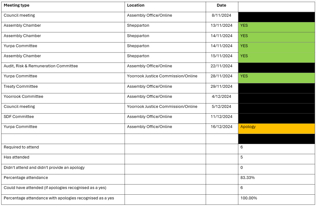 I am a general seat holder representing Melbourne Metropolitan Region. I have been attending Assembly meetings to support the Treaty journey ensuring the community voices are being heard and represented in all activities/ meetings of the Assembly.